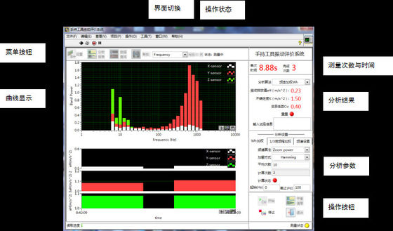 Die Softwareschnittstelle besteht aus einer Bedientaste, einer Menütaste, einer Kurvenanzeigeschnittstelle, einer Analyseeinstellung und einem Analyseergebnis.Die Analyseeinstellung und die Anzeigeschnittstelle werden auf der oberen Schnittstelle angezeigt, um die Bedienung durch den Benutzer zu erleichtern.Durch Schnittstellenumschaltung können die Zeitbereichskurve, die Schwingungsenergiepegelkurve, die 1 ≤ 3-Oktavkurve, die Leistungsspektrumkurve und die Testdatenanalyseschnittstelle des Messvorgangs angezeigt und umgeschaltet werden.